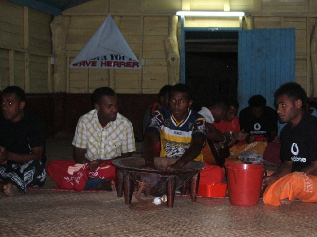 Taking our seats on the straw-matted floor, the males of the village prepared the kava by crushing it to powder, wrapping it in cloth and pouring water through it.