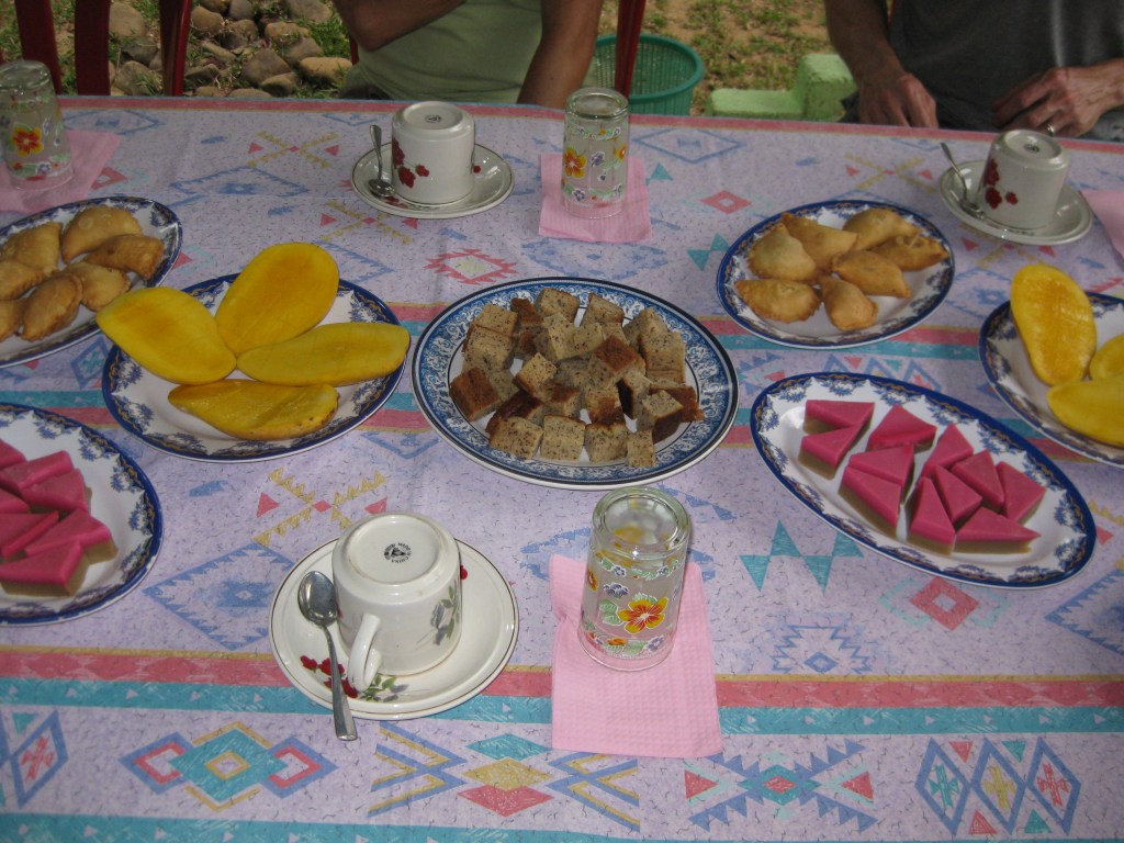 When we finally get to our guest house afternoon tea is waiting. We scoff down, mango slices, banana bread, curry puffs and Malay sweets that look and taste similar to Japanese mo-chi sweets.