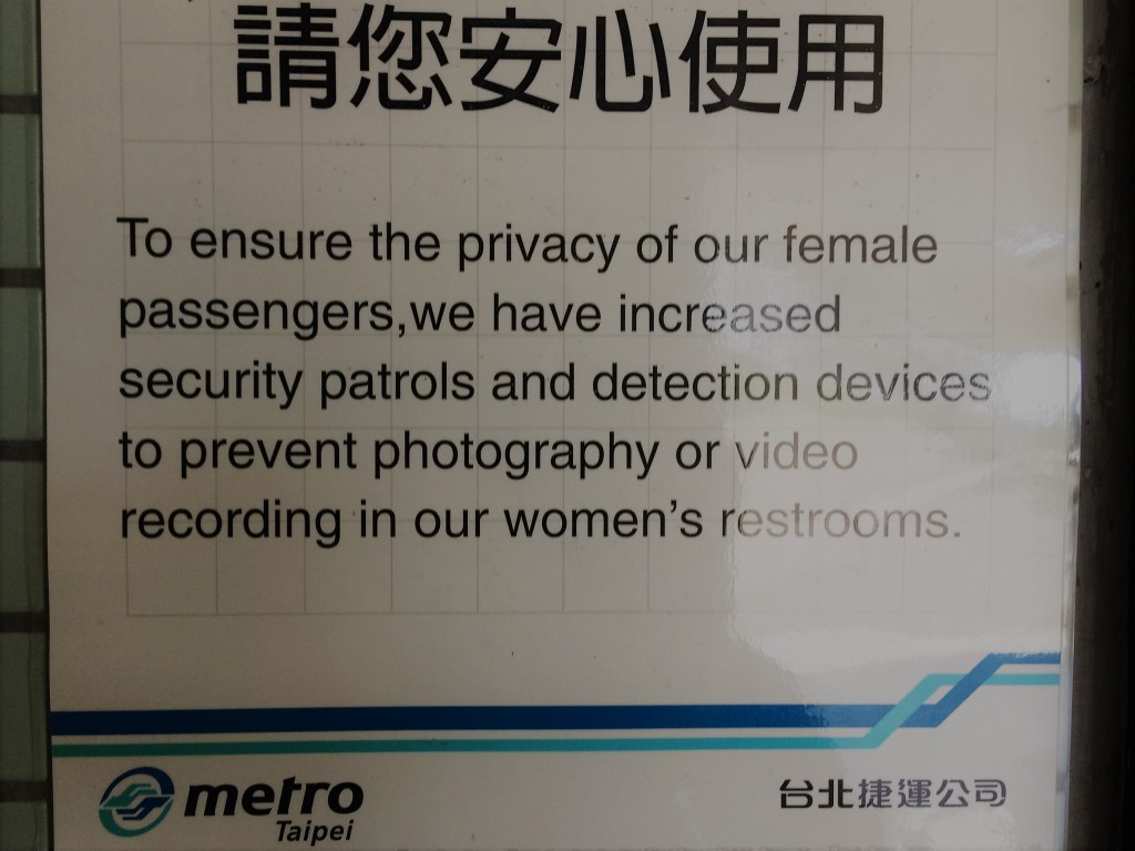 Apparently, concealed recording devices in public bathrooms, was (and perhaps still is) such a common occurrence in Taipei, that these signs appeared with depressing regularity outside and in every restroom I visited. From tourist attractions to department stores and metro stations.