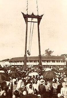 In the ultimate display of risk versus reward, teams of 4 or 5 men would climb ladders to the swinging platform. They would then use their momentum ( and a rope pulled by helpers on the ground) to raise the swing level with bags of gold coins that were fixed atop a separate pole nearby.