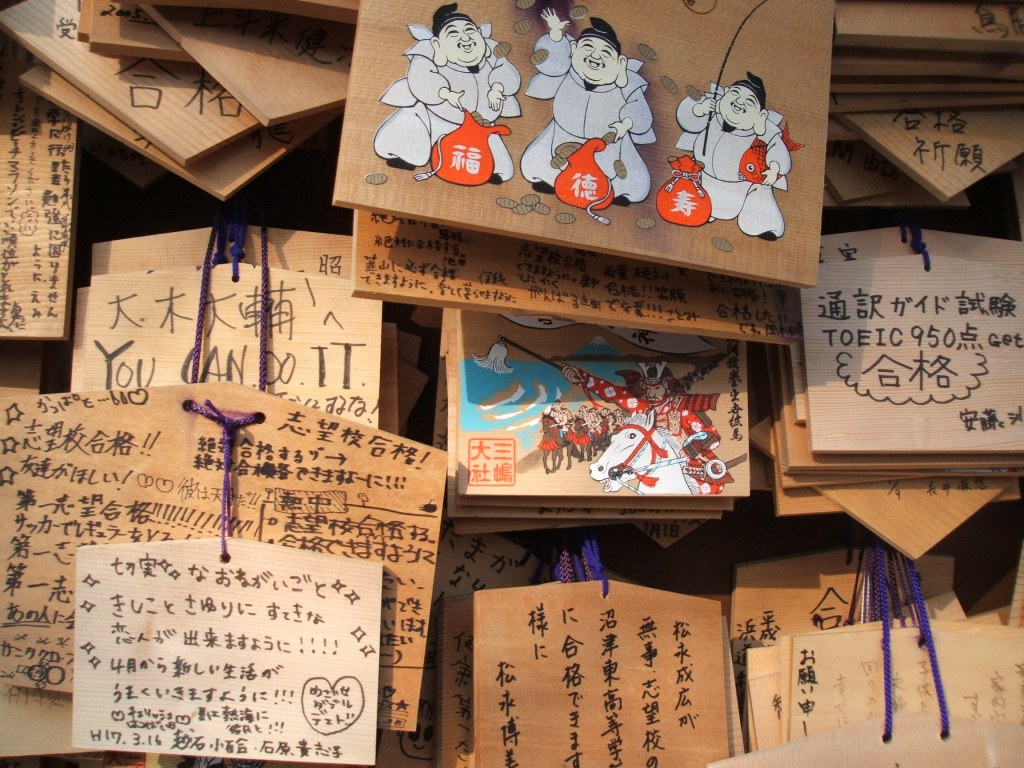 Ema: wooden tablets on which messages to the gods are written and then hung from frames in front of the temple.